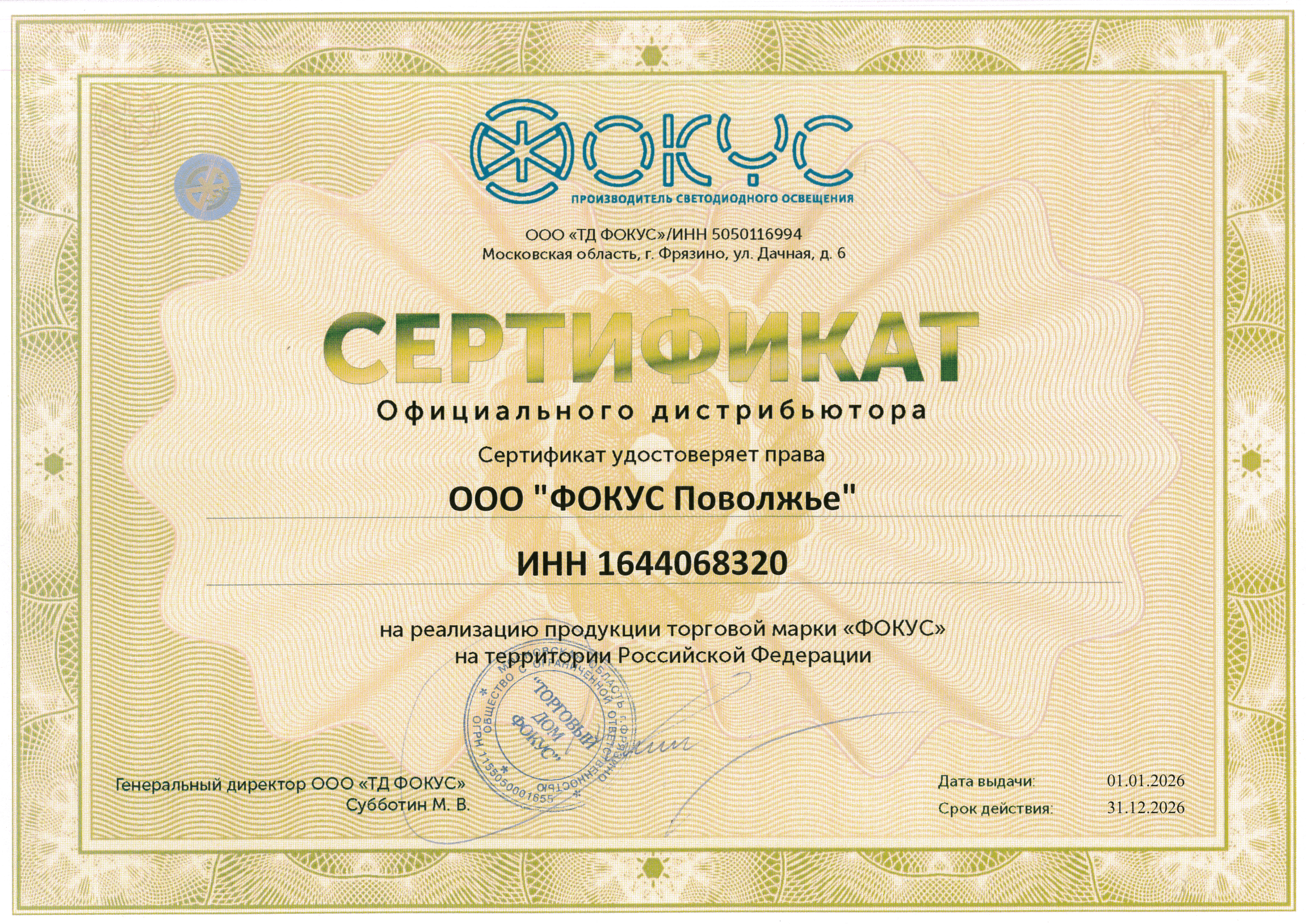 ООО «ФОКУС Поволжье» — официальный дистрибьютор компании «ФОКУС», одного из лидеров по производству светодиодных светильников в России. Продукция поставляется по всей стране, а также экспортируется в страны СНГ.